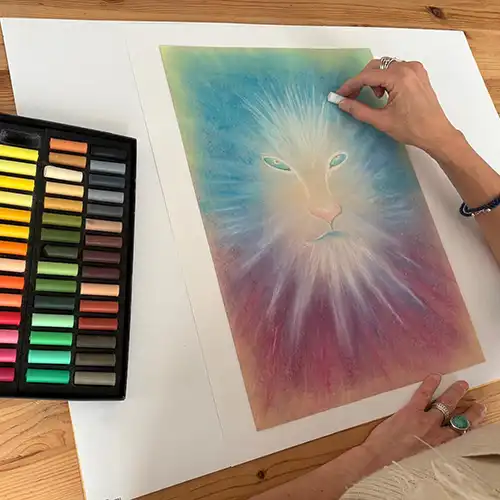 Intuïtief werken met pastelkrijt is een krachtige therapeutische methode waarin meditatie, mindfulness en beeldende kunst samenkomen. Je wordt volledig afgestemd begeleid in een meditatie, waarna je met soft pastelkrijt op papier gaat werken. Wat de meditatie in jou heeft aangeraakt, vormt het vertrekpunt van jouw tekening.
