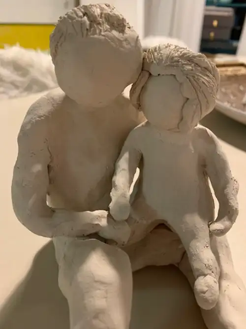Ik verloor 3 jaar geleden mijn vader en kon niet goed omgaan met het verdriet en het rouwen en wilde daar een weg in vinden. Ik kwam bij Mirjam terecht. We zijn begonnen met dit beeldje maken in stappen. Bij elke stap werd er stilgestaan bij het gevoel die er bij mij op kwam en hoe ik verder wilde met dit beeld. Ik had een foto van mij en mijn vader meegenomen, om een beetje een idee te krijgen hoe ik wilde dat het beeldje eruit moest komen te zien. Ik leerde praten over mijn gevoelens en leerde op een andere manier rouwen. Op een manier die minder zwaar viel en dat had ik erg nodig. Wat ik zo mooi vond aan het hele proces van het beeldje maken, was dat je uiteindelijk eindigt met een heel ander beeld dan je in gedachte had. Doordat je stap voor stap stilstaat bij je gevoelens, veranderen je ideeën ook.